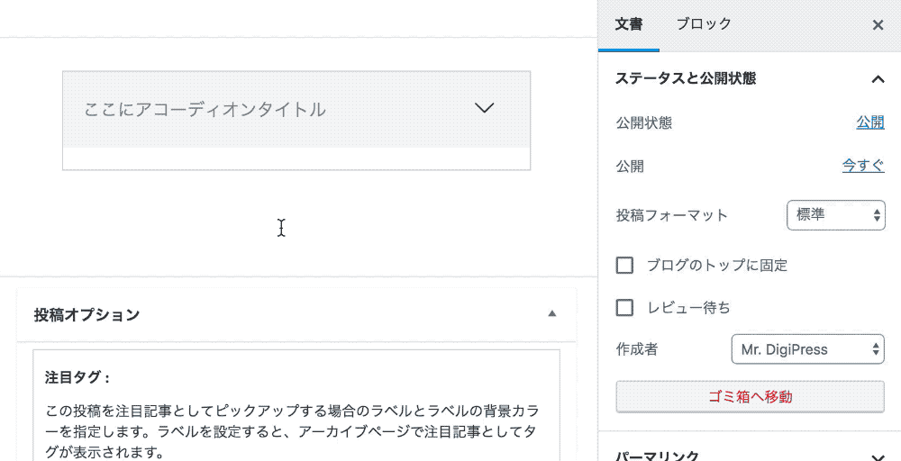 タイトルをクリックすると、その内容が開閉表示されるアコーディオンパネルコンテンツを表示するオリジナルブロックです。
