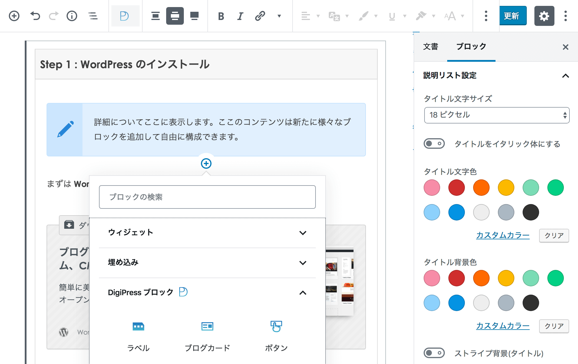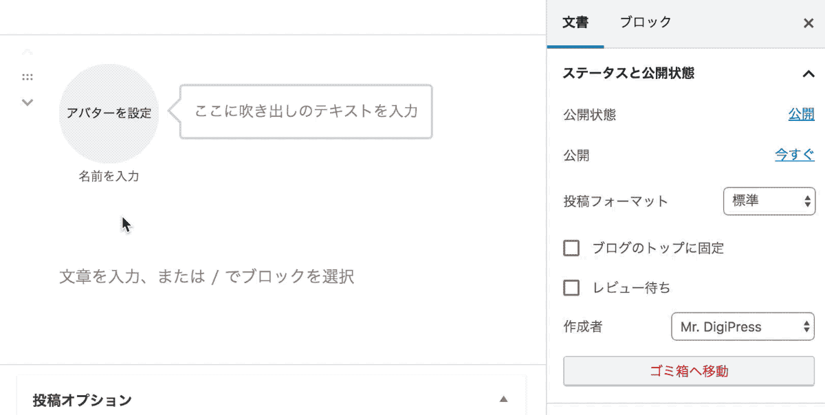 専用プラグイン「DigiPress Ex – BLocks Free」、または「DigiPress Ex – Blocks」とセットで利用すると、WordPress の標準ブロックを大幅に拡張して使い勝手を向上させます。