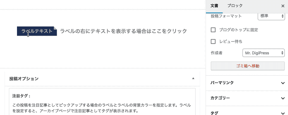 テーマにプリセットのCSS装飾を利用したテキストラベルを表示するオリジナルブロックです。