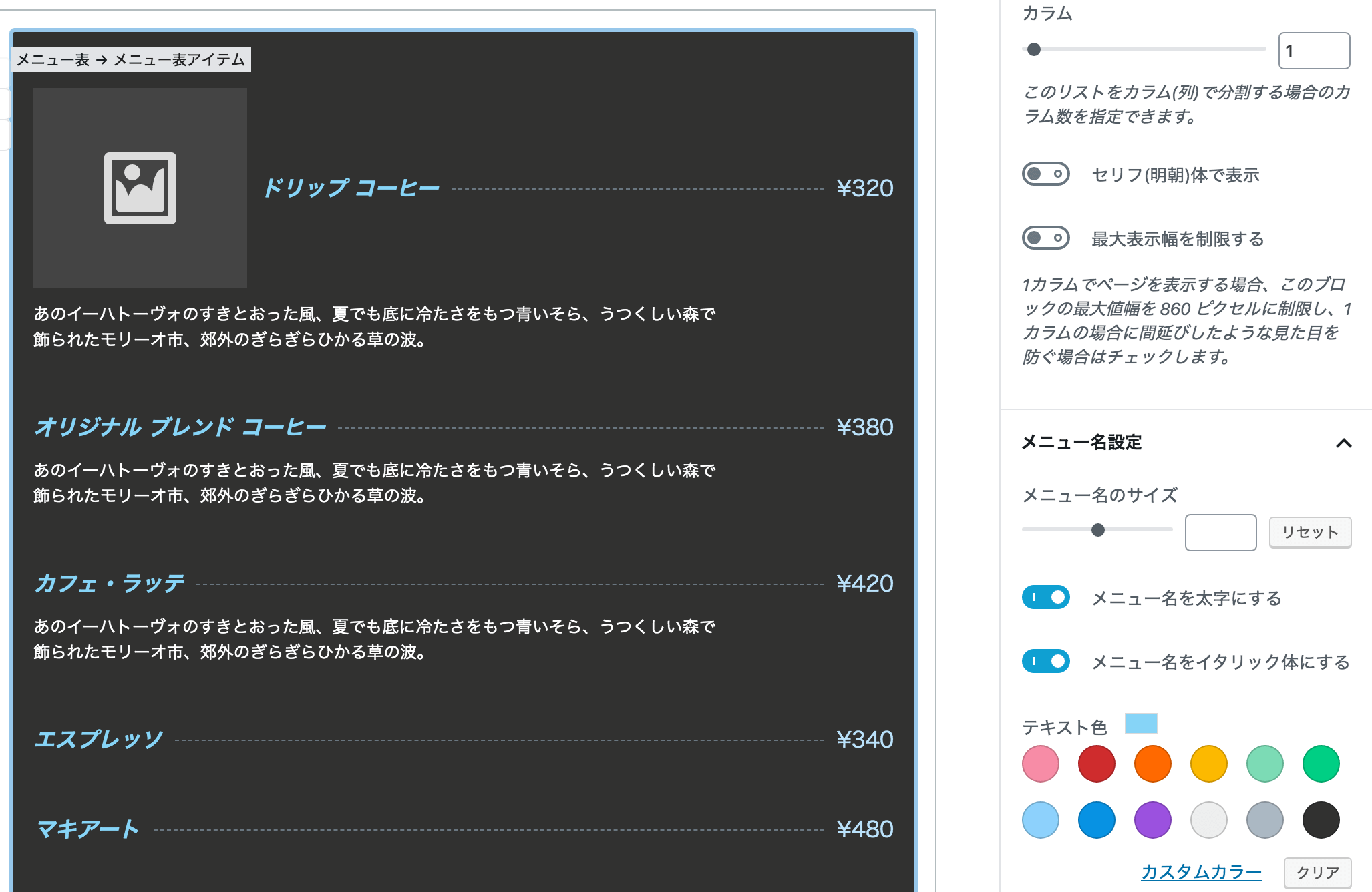 このブロックでは、飲食店などでよく見かけるメニューをWebページ上のコンテンツとして表示したい場合に活用できます。