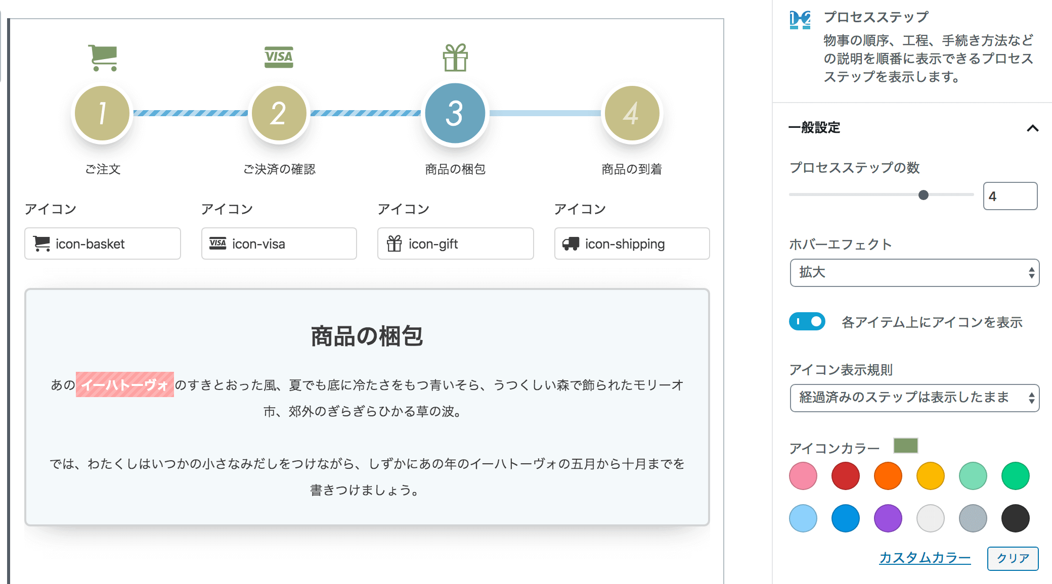 このブロックでは、物事の順序、工程、手続き方法などの説明を順番に表示できるプロセスステップ(工程)コンテンツを表示します。