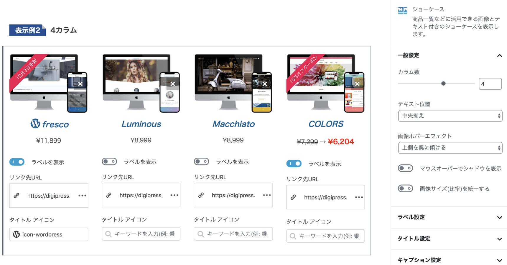 アイコンの大きさやボックス背景、ボーダーなどの配色、形状をカスタムでき、リストは最大3カラムまで設定できます。